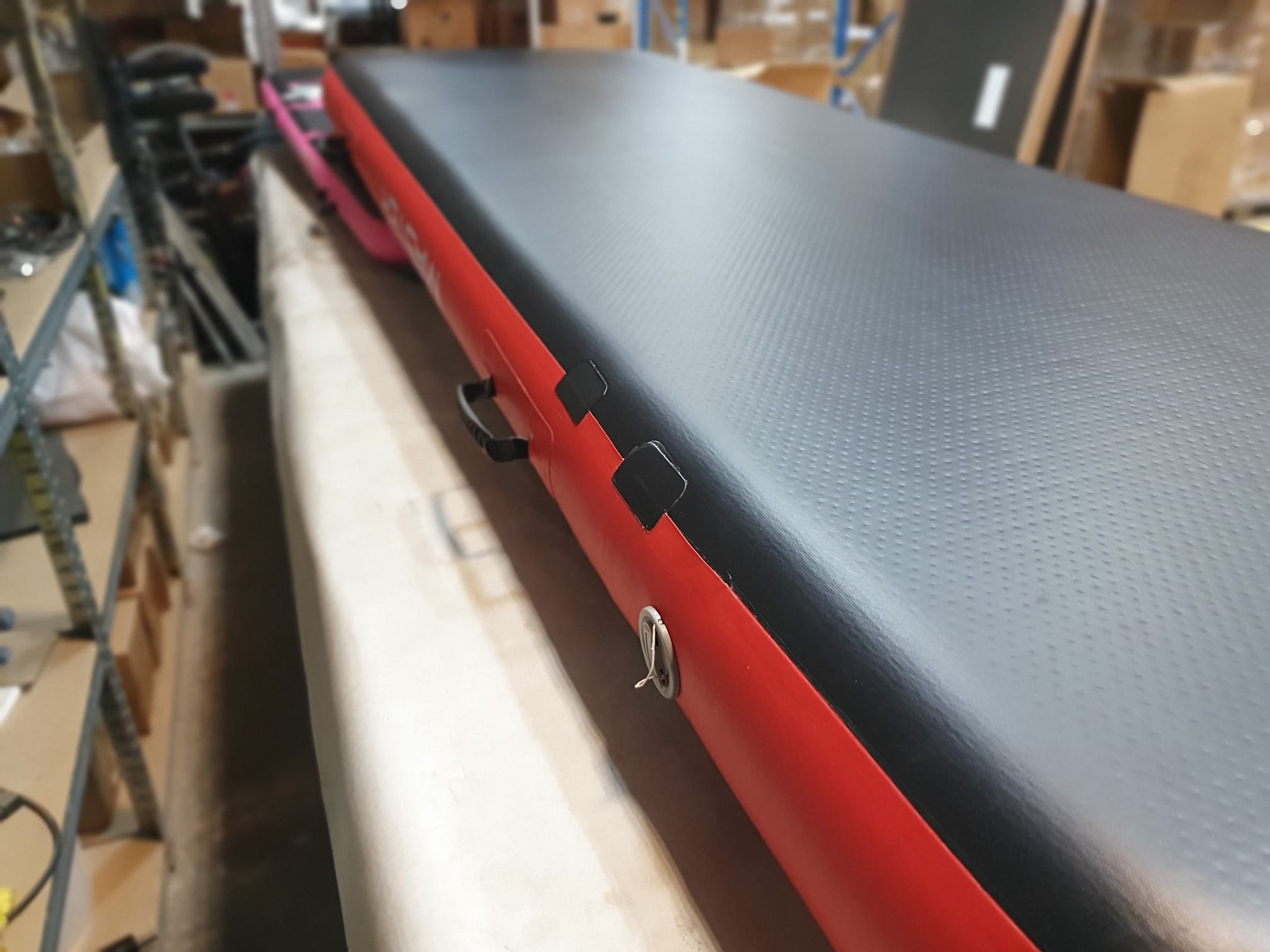 Airtrack MASTER nafukovací žíněnka 300 x 100 x 20 cm - černá - červená - 2. jakost je po opravě tří drobných defektů. Naše servisní oddělení závady profesionálně zalepilo a následně testovalo airtrack na únik vzduchu.