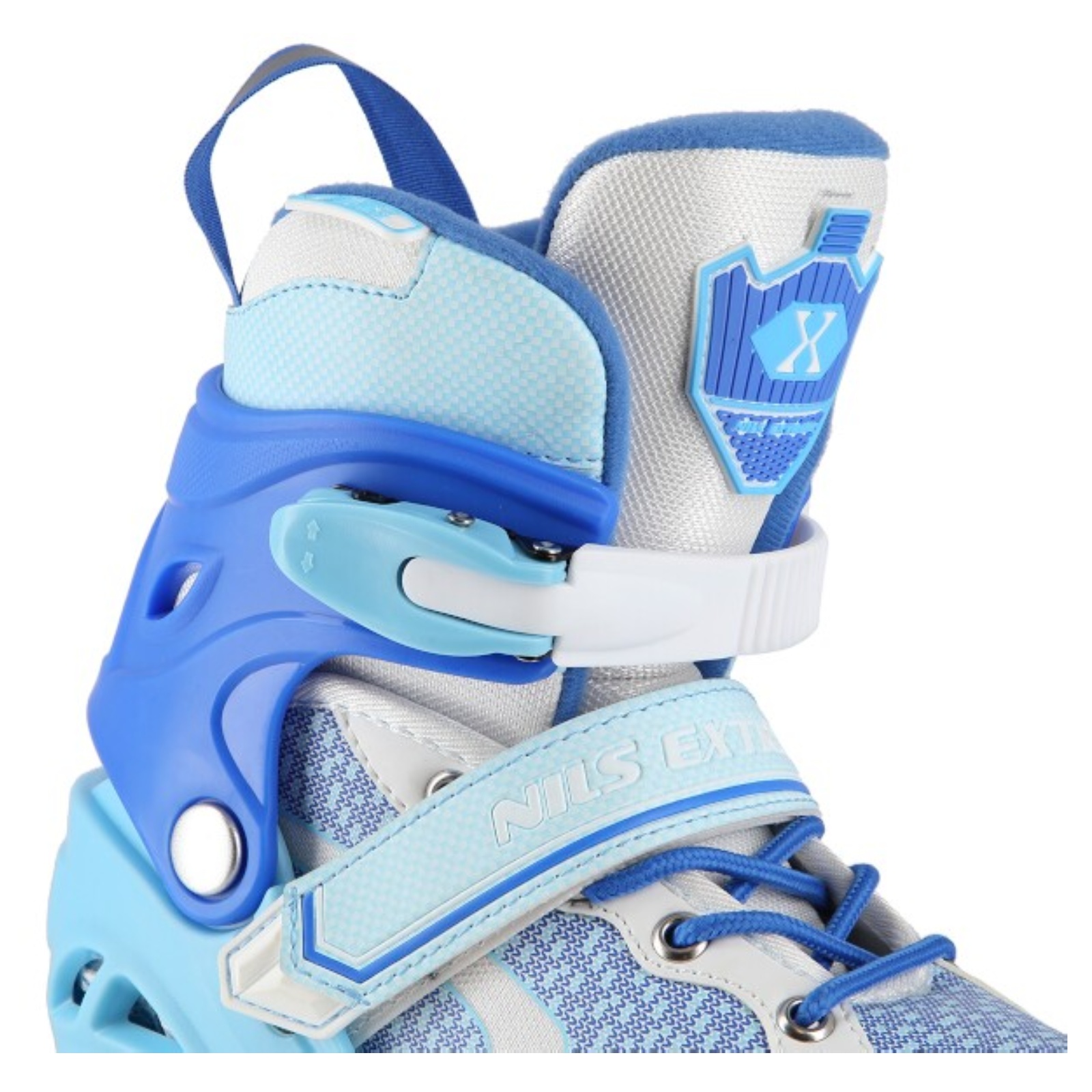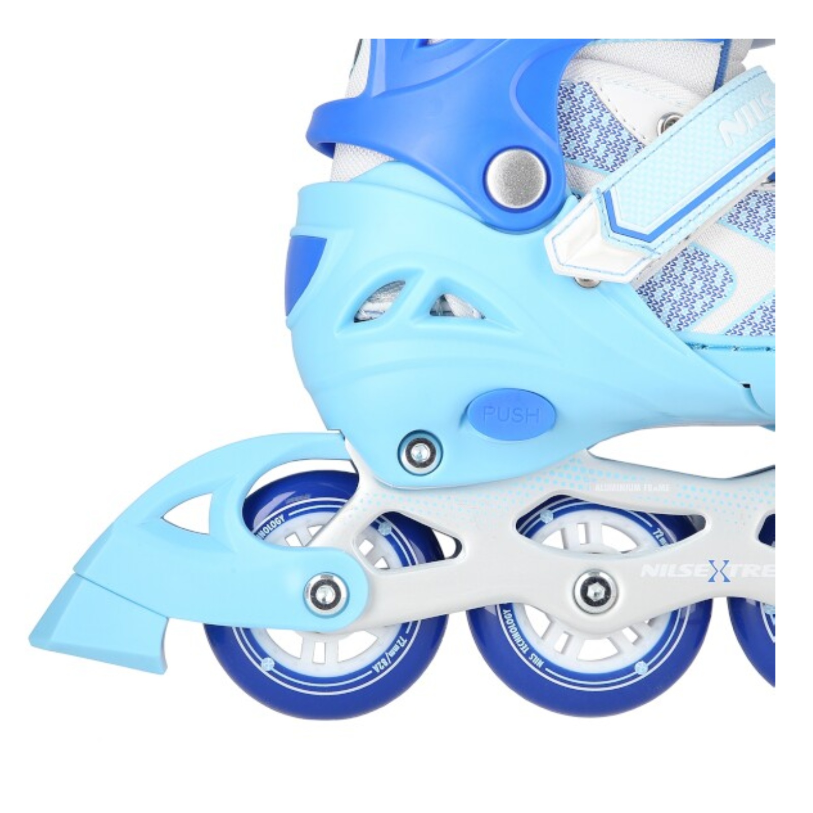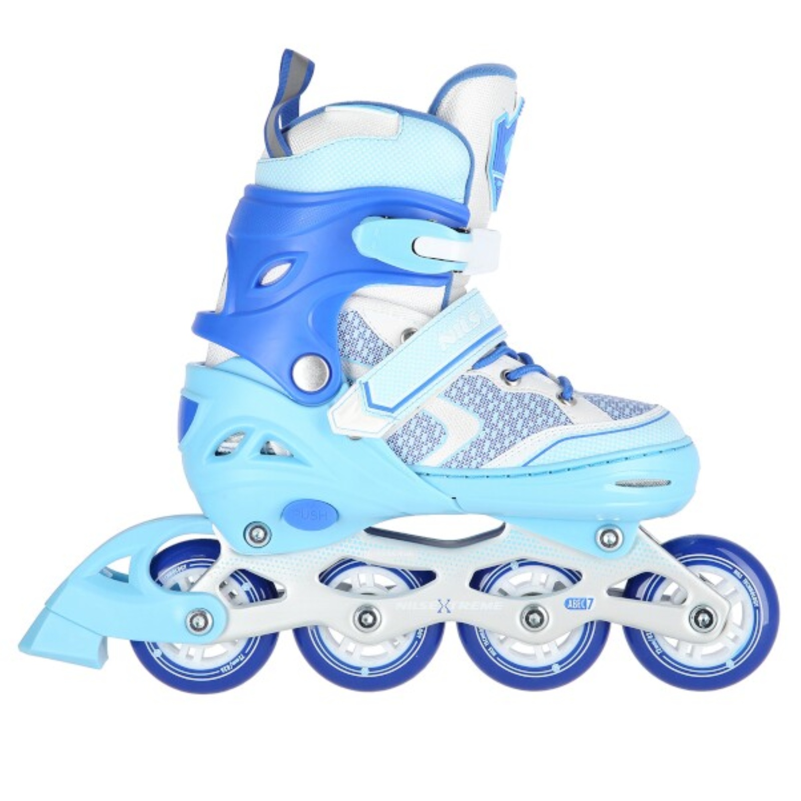 Kolečkové brusle NILS Extreme NA14198 jsou určeny pro začínající a rekreační jezdce. Model NA14198 v sobě snoubí poutavý design a komfort používání. Hliníkový podvozek je osazen měkkými PU kolečky s ložisky ABEC7 pro svižnou jízdu. Vnější bota je pomocí stisku tlačítka nastavitelná do čtyř velikostí, toto řešení umožňuje precizní přizpůsobení velikosti podle aktuálních potřeb anebo se používá jako "rostoucí bota", která "roste" spolu s nohou dítěte. Na špičce jsou ventilační otvory pro maximální prodyšnost. Vnitřní bota je vyrobena z kombinace syntetické kůže, síťoviny MESH, EVA a pěny o vysoké hustotě. Zapínání je řešeno klasickou trojkombinací - šněrování, řemínek se suchým zipem a dvousekční přezka.