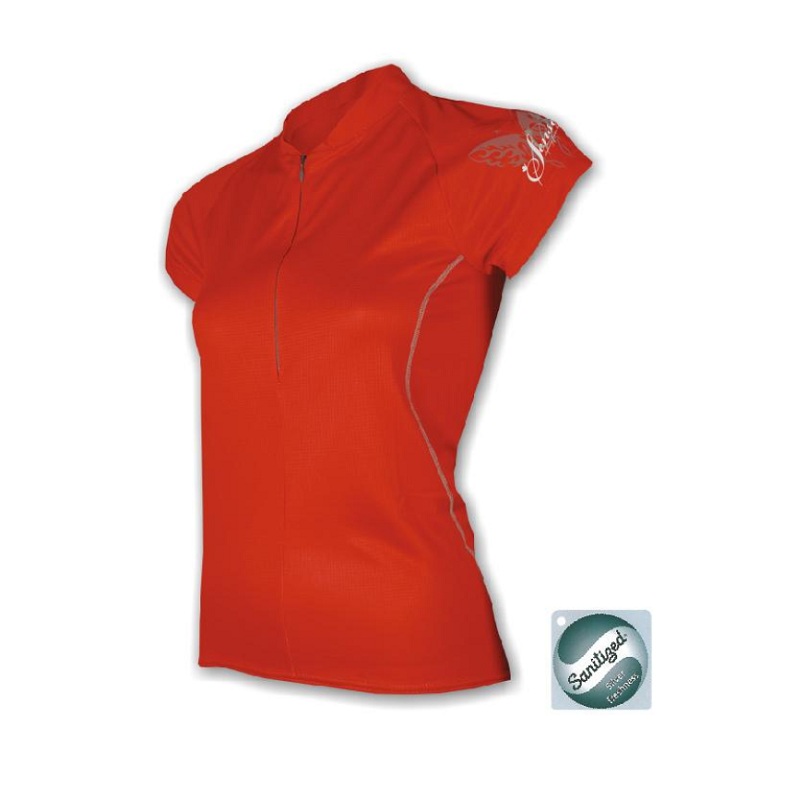 Dres krátký rukáv SENSOR Entry dámský S červený je vyroben ze 100% micropolyesteru s antibakteriální úpravou Sanitized. Dres polopřiléhavého střihu s třetinovým stojáčkem, krátkým rukávem raglánového střihu a volným zakončením má dvě kapsy na zádech a stylový potisk na rukávu.