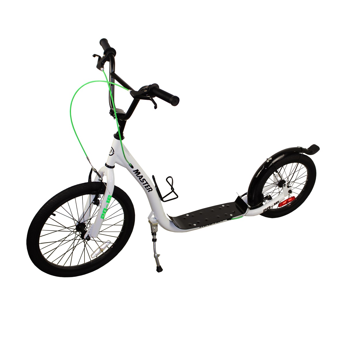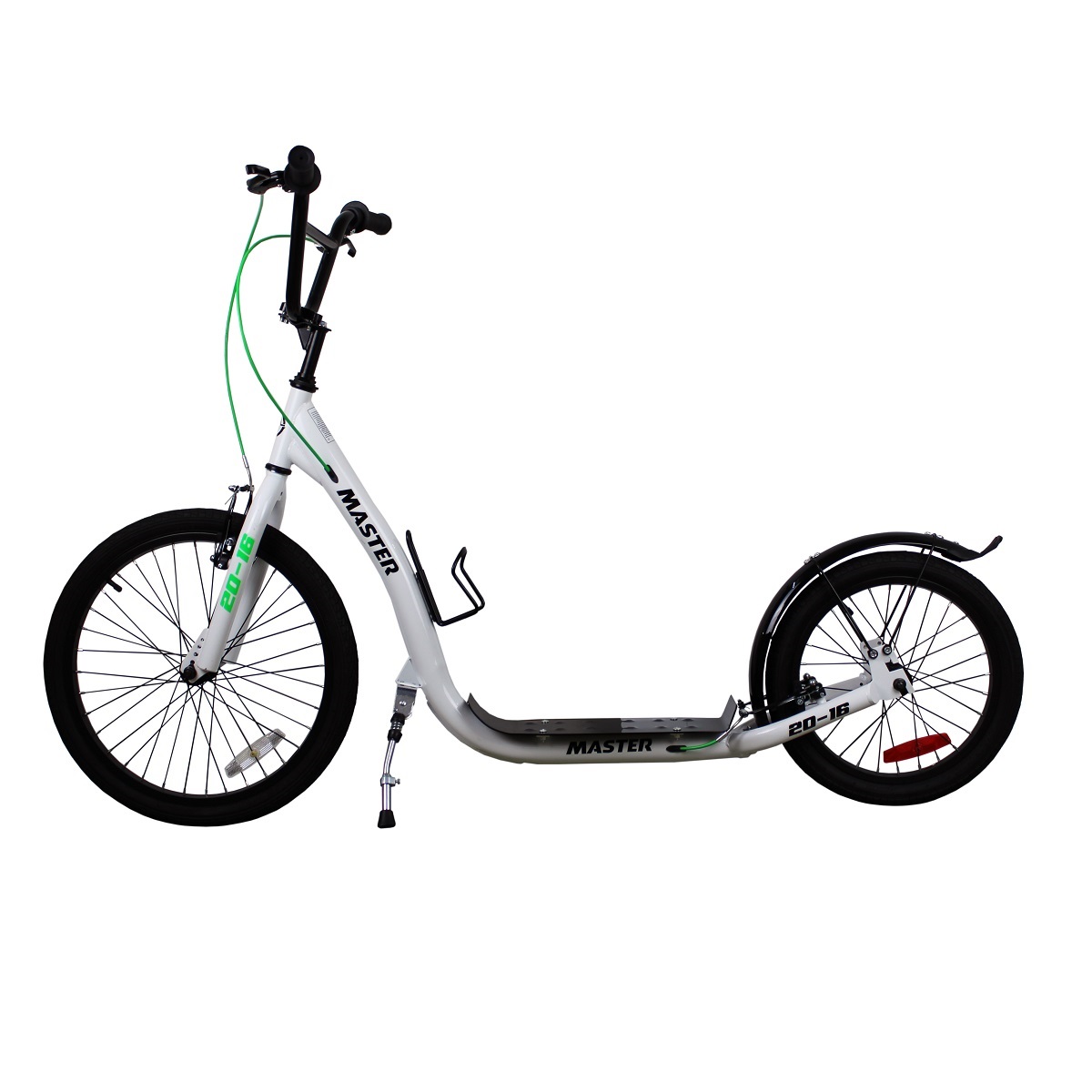 Koloběžka MASTER 20-16 má velmi stabilní rám. Koloběžka je díky velkým kolům určena pro rychlou jízdu, je vhodná pro rekreační jízdu na rovném povrchu, případně i jízdu v mírném terénu. Koloběžky MASTER splňují nejvyšší bezpečnostní standardy.