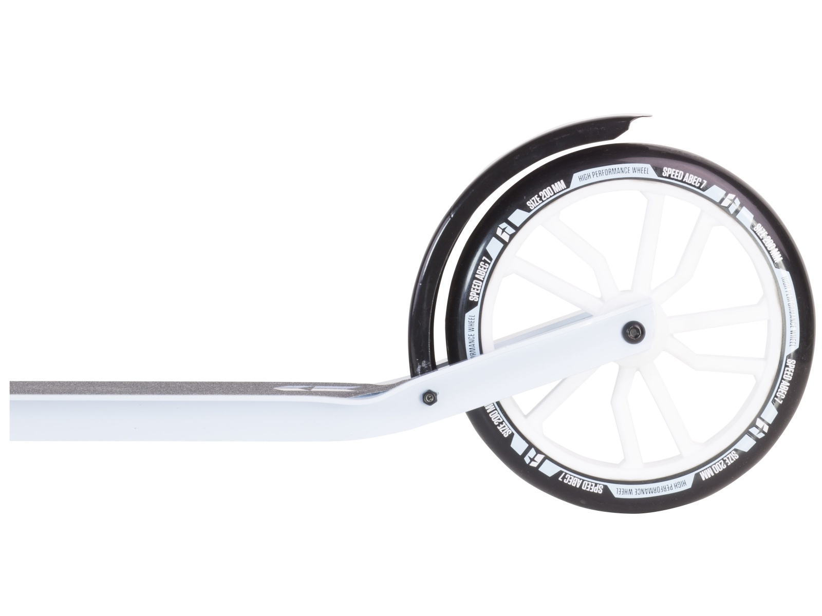 Koloběžka má stojánek, takže ji nemusíte pokládat na zem nebo hledat místo k opření. Můžete ji také jednoduše složit a její přenesení a uskladnění je tak velmi snadné. Brzda nad zadním kolečkem zajišťuje včasné zastavení a ideální kontrolu jízdy.