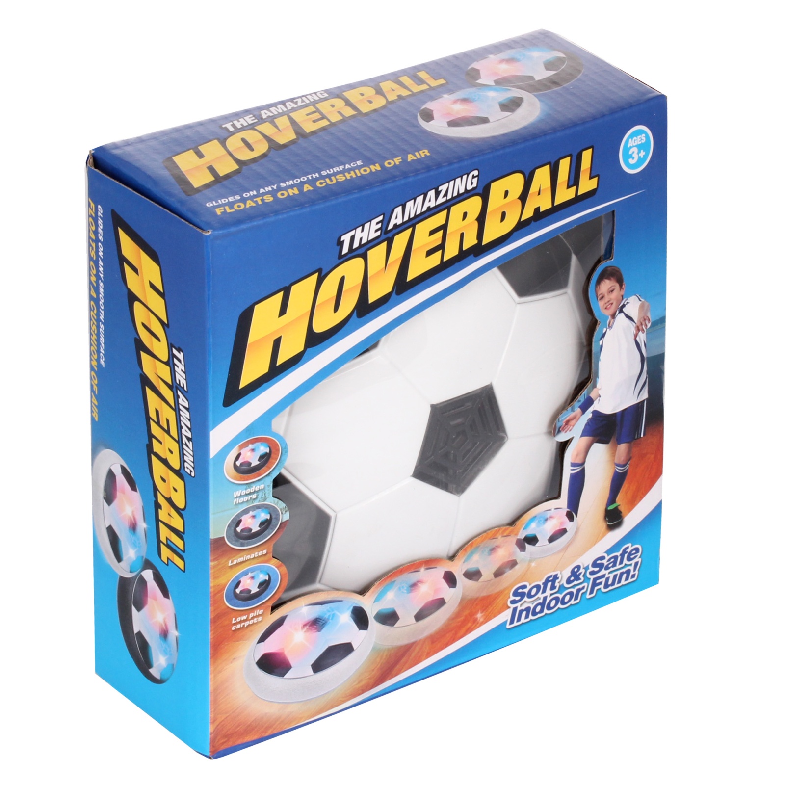 Míč je navržený pro použití na rovném, hladkém povrchu jako je dřevěná podlaha, obklady, nízký vlasový koberec nebo dokonce venkovní chodník. Vnější okraj fotbalového disku je vyroben z měkkého pěnového polštáře, který chrání váš nábytek a zeď před poškozením. Pozemní míč je vhodný pro děti starší 3 let i dospělé. Pozemní míč Hover Ball je napájený pomocí 3 baterií , které nejsou součástí balení.