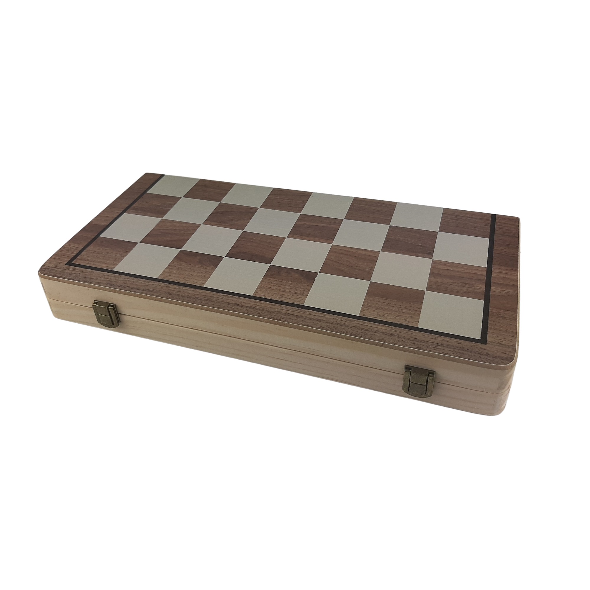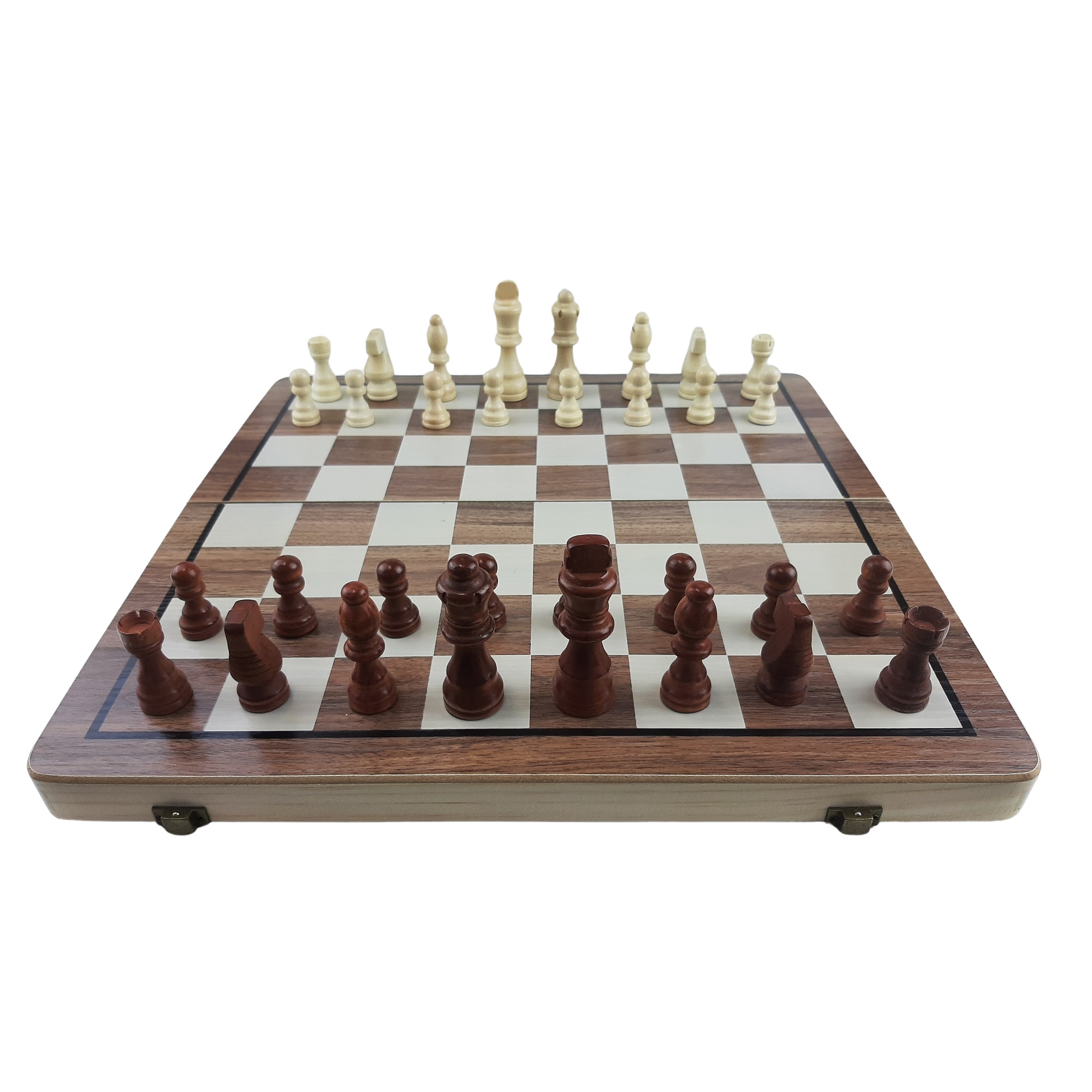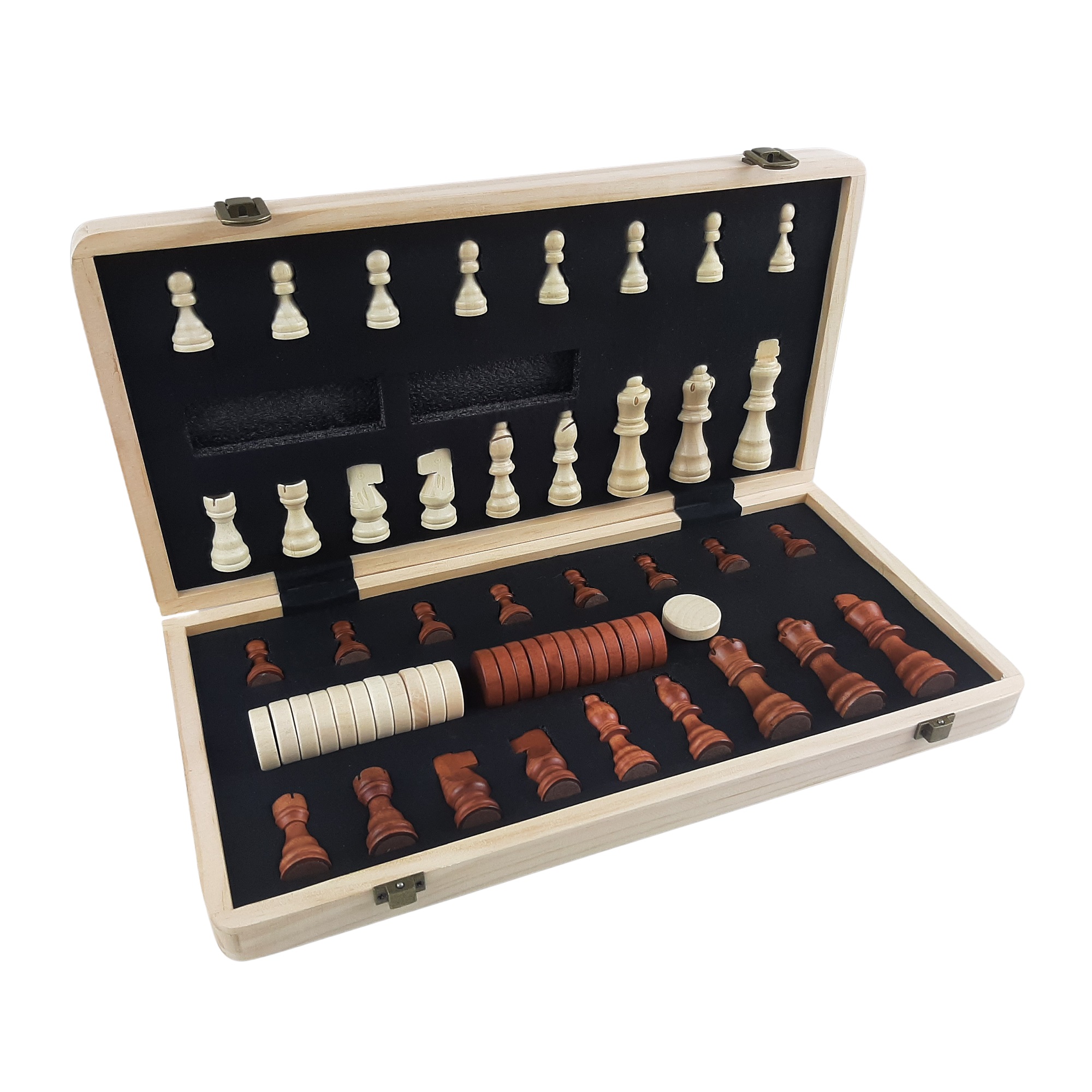 Klasické dřevěné šachy v kvalitním dřevěném kufru, který je zároveň šachovnicí o rozměru 39 x 39 cm. Kromě obvyklého setu šachových figurek obsahuje balení také dvě náhradní figurky dam, set doplňuje 24 kamenů pro klasickou hru dáma. Šachové figurky mají ve spodní části magnet, díky kterému na šachovnici přijemně drží a nehrozí tak jejich posunutí např. při nechtěném pohybu.