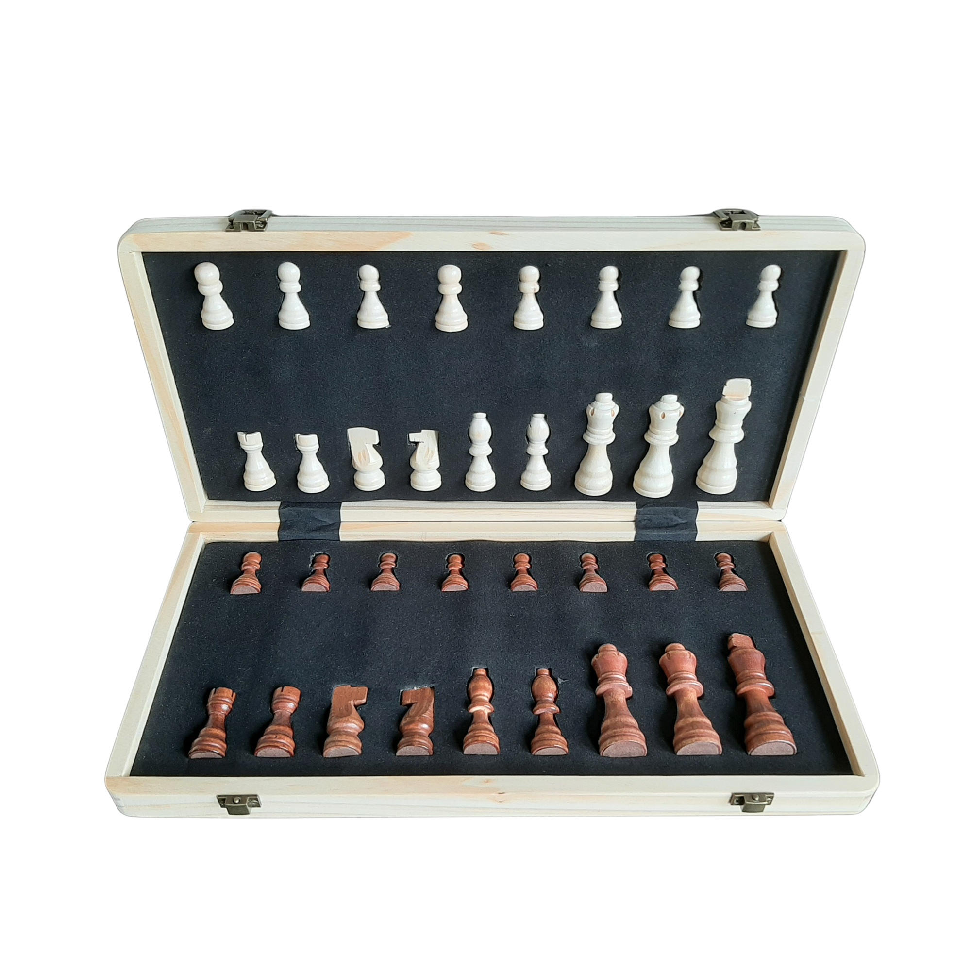 Klasické dřevěné šachy v kvalitním dřevěném kufru, který je zároveň šachovnicí o rozměru 39 x 39 cm. Kromě obvyklého setu šachových figurek obsahuje balení také dvě náhradní figurky dam. Šachové figurky mají ve spodní části magnet, díky kterému na šachovnici přijemně drží a nehrozí tak jejich posunutí např. při nechtěném pohybu.