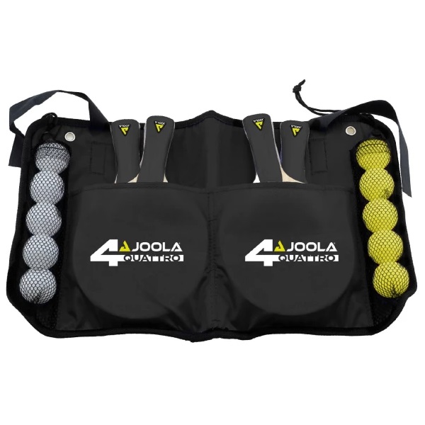 Set na stolní tenis JOOLA Quatro je primárně určen pro až čtyři hráče. Skládá ze 4 pálek JOOLA Spirit a 10 míčků JOOLA Advanced (5 bílých / 5 žlutých). Součástí balení je praktická úložná taška, ve které lze snadno uložit jak všechny 4 pálky tak i míčky.