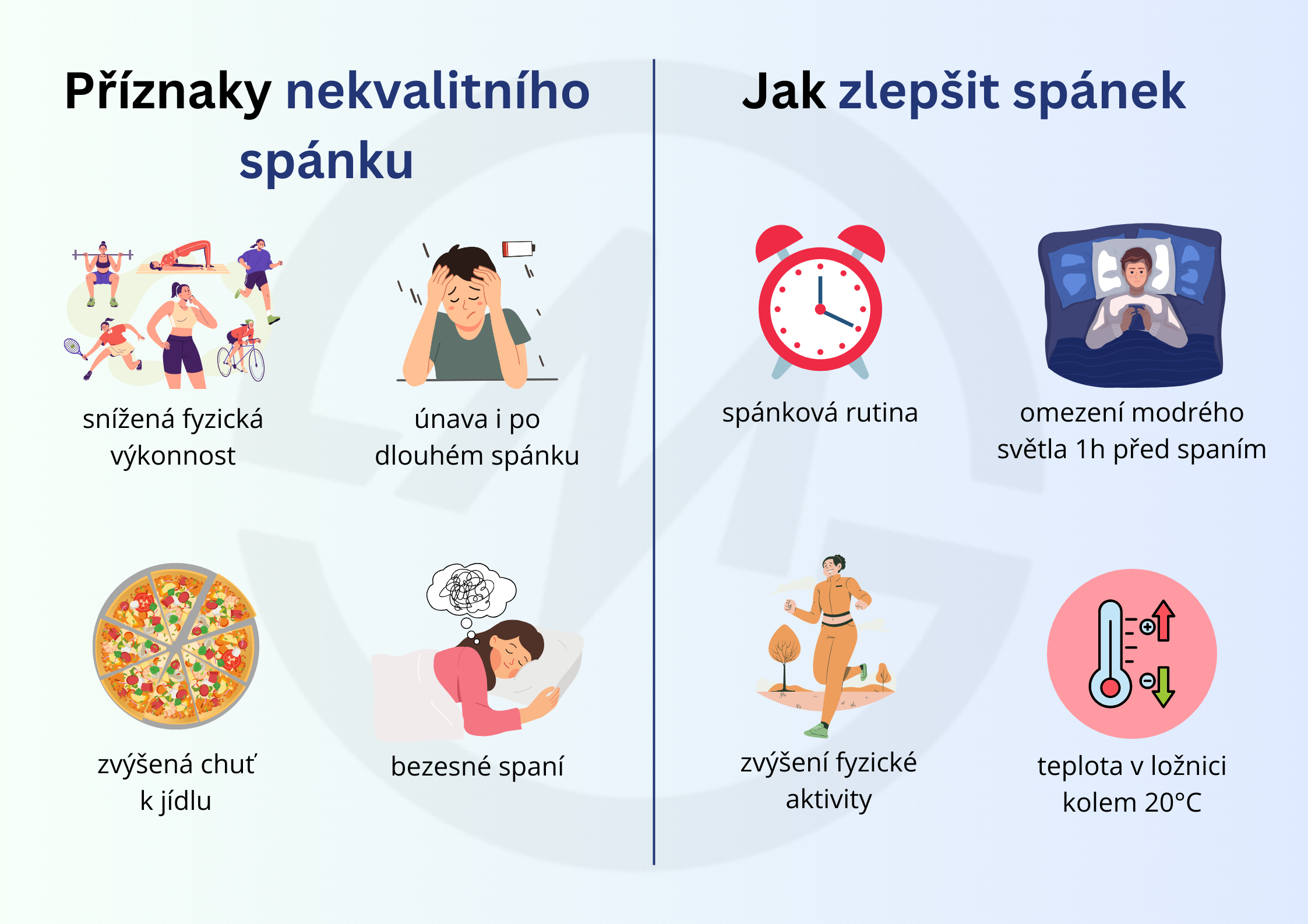 - Nesprávná stravaKonzumace kofeinu nebo těžkých jídel před spaním může mít negativní vliv na kvalitu spánku. Je vhodné vyhýbat se stimulujícím látkám a těžkým jídlům ve večerních hodinách.