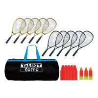 Speed badmintonový set TALBOT TORRO Speed 4000 je vhodný až pro 10 hráčů. Základem setu je 10 raket Speed 4000 (délka 54,5 cm - o 2 cm kratší, tenký profil rámu 17,3 mm, hmotnost pouze 165 g) vyrobených z tvrzeného lehkého hliníku. Tento typ rakety je vhodný zejména pro začátečníky, ale je také vhodný pro každého rekreačního či příležitostného hráče. Set dále obsahuje 3 dózy míčků (12 rychlých "závodních", 6 pomalejších "startovacích míčků") a 40 značek pro vyznačení hracích ploch (stojí volně na zemi a není třeba je fixovat - např. ve sportovní hale). Vše je zabaleno v prostorné robustní sportovní tašce se zipem, popruhy a logem výrobce.