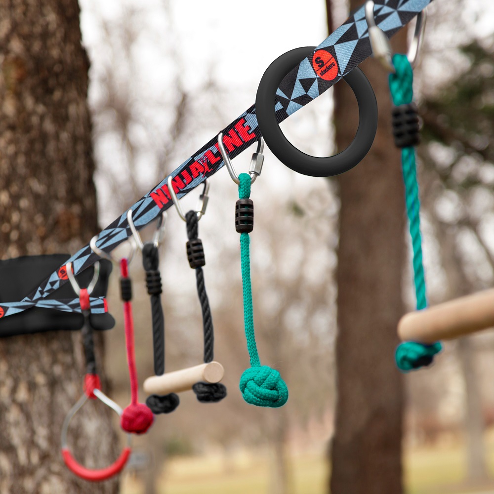 Oblíbená řada SLACKERS Ninja Line v novém designu a s novými překážkami! 11 m dlouhý Ninja popruh (použitelná délka cca 9 m), šířka 5 cm, se všitými smyčkami pro ukotvení překážek a šplhacích madel. V setu je také pevná kovová ráčna s plastovou rukojetí a všitou smyčkou, to vše v pevné tašce na přenášení. V lajně je našito 14 oček pro ukotvení madel a překážek pomocí bezpečnostních kovových delta karabin. Sada obsahuje celkem 2 gymnastické kruhy, 2 opičí houpačky, 2 opičí pěsti a 1 hrazdový kruh. Základní popruh/lano Ninja lze použít také jako klasický slackline. Vše je zabaleno v krabici včetně praktické tašky, popisu a návodu.