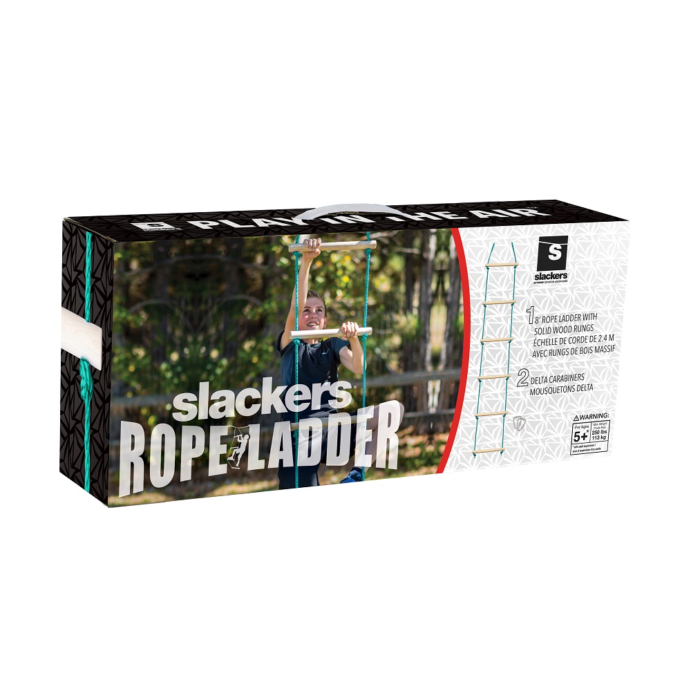 Robustní a všestranný provazový žebřík SLACKERS Ninja 2,5 m z materiálu odolného proti povětrnostním vlivům. Syntetické lano dlouhé 2,5 m, se 6 kulatými, robustními dřevěnými příčkami (průměr 3 cm, šířka 38 cm). Žebřík lze snadno připevnit pomocí dvou přiložených delta karabin i bez použití nářadí. Ideální doplněk k zahradním houpačkám Ninjaline, dětským domkům na stromech apod. Maximální nosnost: 113 kg.
