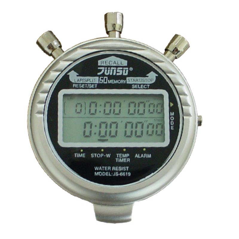 Profesionální voděodolné digitální stopky JUNSO JS-6619 v kovovém těle s pamětí na 60 časů, dvouřádkovým displejem a přesností měření 1/100 sek.