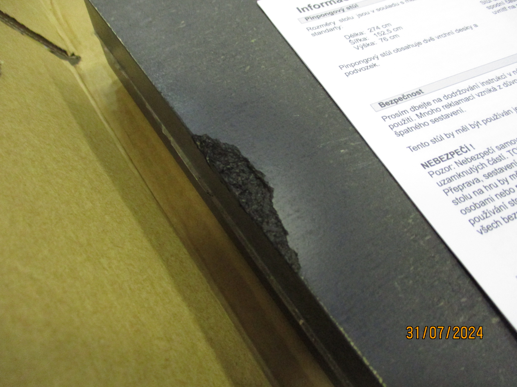 Stůl na stolní tenis SPONETA S1-13i - modrý - 2. jakost je naprosto v pořádku, nešetrnou přepravou došlo k poškození spodní hrany hrací desky. POstižené místo bylo ošetřeno černou barvou a stůl byl opět zabalen. Jedná se spíše o kosmetickou vadu, která nemá na praktické používání stolu žádný vliv.