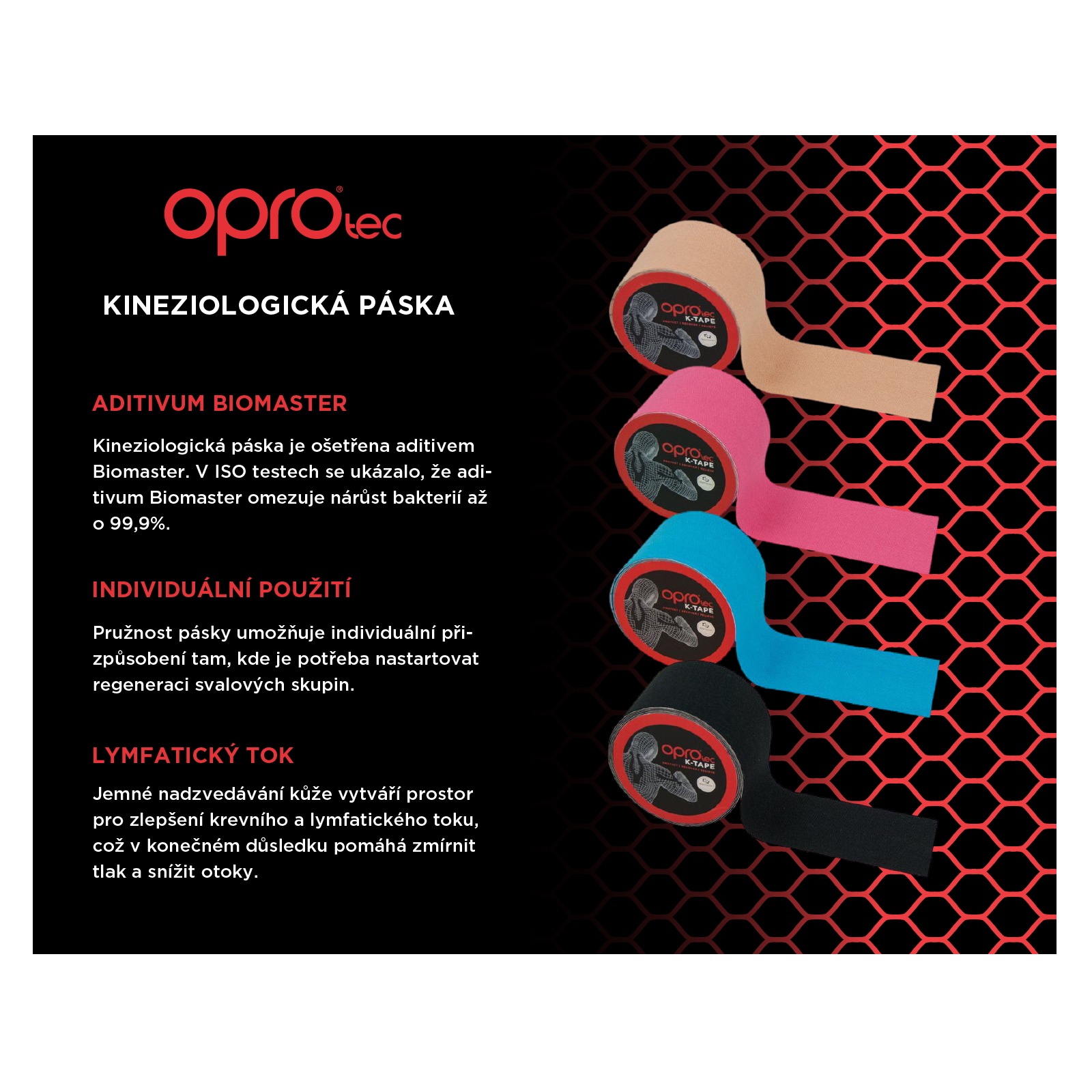 OPROtec Kineziologická páska určená k tomu, aby přirozeným procesem hojení vašeho těla pomohla naplno využít jeho potenciál. Při aplikaci na oteklé, nebo poraněné svaly páska nazdvedne vaši pokožku tak, aby svaly a klouby mohly dýchat, což umožní volnější a přirozenější pohyb. Stejně jako okamžitá úleva, prostor, který kineziologická páska vytváří kolem svalu, také pomáhá podporovat průtok krve a zároveň odvádí veškerou tekutinu.